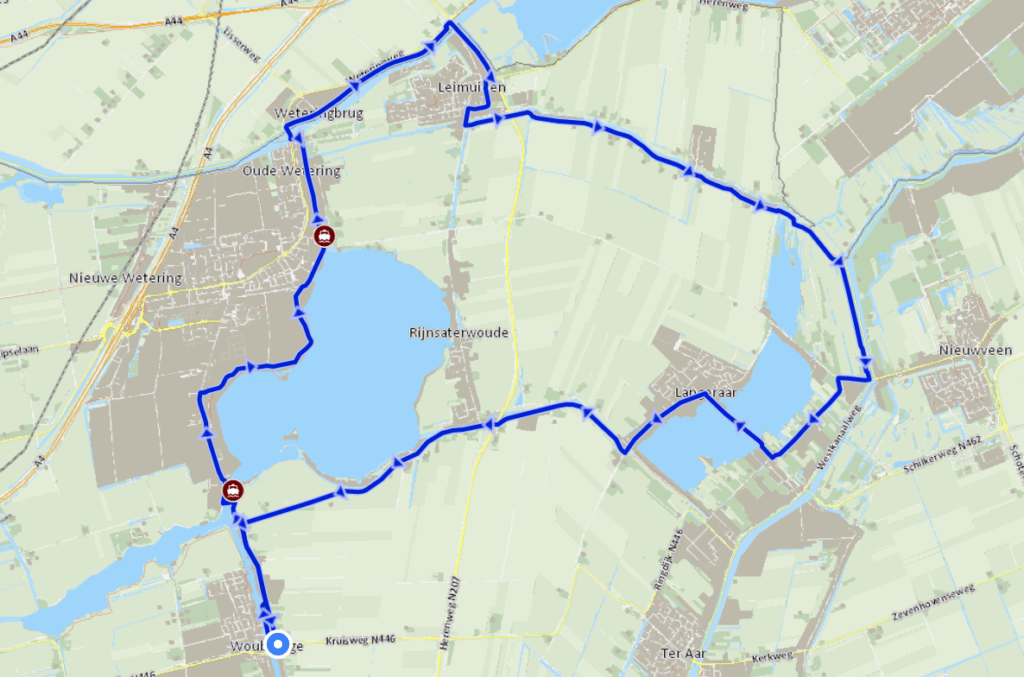Woubrugge, het beginpunt, is een sfeervol dorp, met al direct de eerste terrasjes aan het water. Zo kun je op je gemak turen naar de voorbijkomende boten. Fietsend naast de Woudwetering kom je langs Aspergehof Noordam. In het aspergeseizoen (eind maart tot eind juni) kun je in de winkel asperges kopen. Ook is er een automaat. Niet veel later neem je het pontje naar de overkant van het Paddegat. Na het sfeervolle sluisje van Roelofarendsveen gaat de route over een fietspad naast het Braassemermeer, met fraaie uitzichten over het water. Palingrokerij van Veen zit in een klein pand. Sjors van Veen zet ’s avonds de netten klaar, waarna zijn vader in de vroege ochtend gaat vissen. De twee roken de vis boven eikenhout. Jaarlijks zetten ze jonge alen uit. Op het Braassemermeer varen zeilbootjes en sloepen voorbij. Er is een scala aan picknickplekken en terrasjes. Ook na het meer blijf je het water volgen: de Oude Wetering, de Ringvaart van de Haarlemmermeerpolder, de Drecht en het Aarkanaal. Je rijdt langs boerderijen en kwekerijen. Na de Langeraarsche Plassen en Leidsche Vaart kom je weer bij het Braassemermeer.