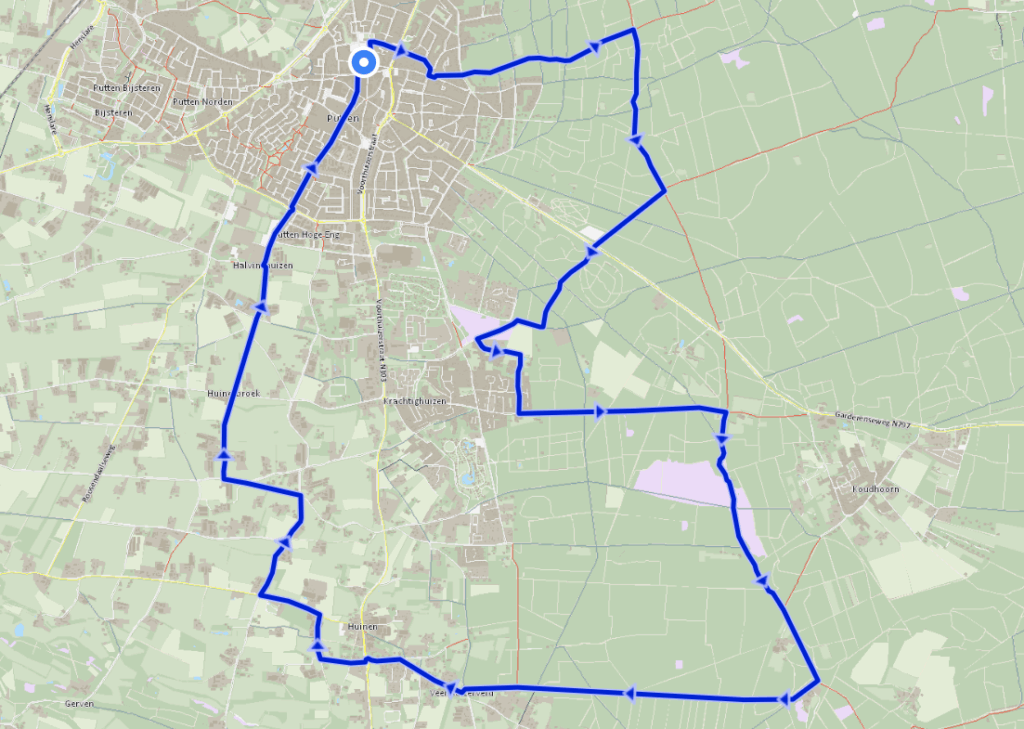 Via een schitterende toegang rijdt u het Putter Bosch in. Via een mooie en slingerende route gaat u naar Veenhuizerveld en Huinen, door het bos en langs de heidevelden bij Krachtighuizen en de Grote Ark. Via een boerenlandschap fietst u langs de oude korenmolen ’t Hert terug naar het centrum van Putten met monumenten en winkels.